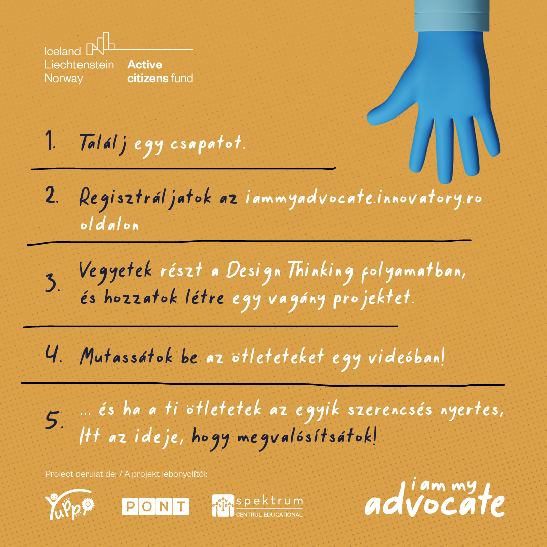 - Az #IAmMyAdvocate projektet a Yuppi Tábormozgalom Egyesület vezeti, 149 900 eurós támogatásban részesül az Active Citizens Fund Románia program keretében, amelyet Izland, Liechtenstein és Norvégia finanszíroz az EGT Alap 2014-2021 keretében. A projektben partnerük a PONT Csoport és a Spektrum Oktatási Központ. A weboldal tartalma nem feltétlenül tükrözi az EGT Alap és a Norvég Alap 2014-2021 hivatalos álláspontját; további információkért látogasson el a www.eeagrants.org weboldalra. Az Active Citizens Fund România alapról a www.activecitizensfund.ro oldalon találhatók információk.